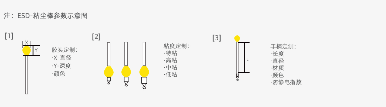 本公司產(chǎn)品技術(shù)參數(shù)及配置如有變更,恕不另行通知。 注: [1] 膠頭寬度的范圍,根據(jù)客戶實際使用環(huán)境定制; [2] 粘塵棒的總長度,在生產(chǎn)過程中會有±1.5mm公差。 |